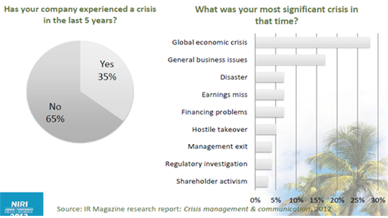 미국 IR Magazine 자료에 따르면 위기관리 매뉴얼을 만들어 대응하고 있는 기업은 69%에 달했고, 그렇지 않은 기업은 22%에 불과했다. 70%에 육박하는 기업들이 위기관리 대응을 하고 있는 것으로 나타났다. 또한 위기 시뮬레이션을 경험한 기업은 40%로 조사되었다. 위기는 언제 어디서 올지 모르기 때문에 회사의 여러 위기 문제를 사전에 정리하여 공유해야 한다. 위기관리 매뉴얼을 만들어 대응체계를 갖추어야 한다. 그렇지 않으면 위기를 예방할 수 없으며 위기가 오면 수습하는데도 오랜 시간이 걸린다. IR에서 위기관리는 선택이 아니라 필수라는 점을 명심하자.